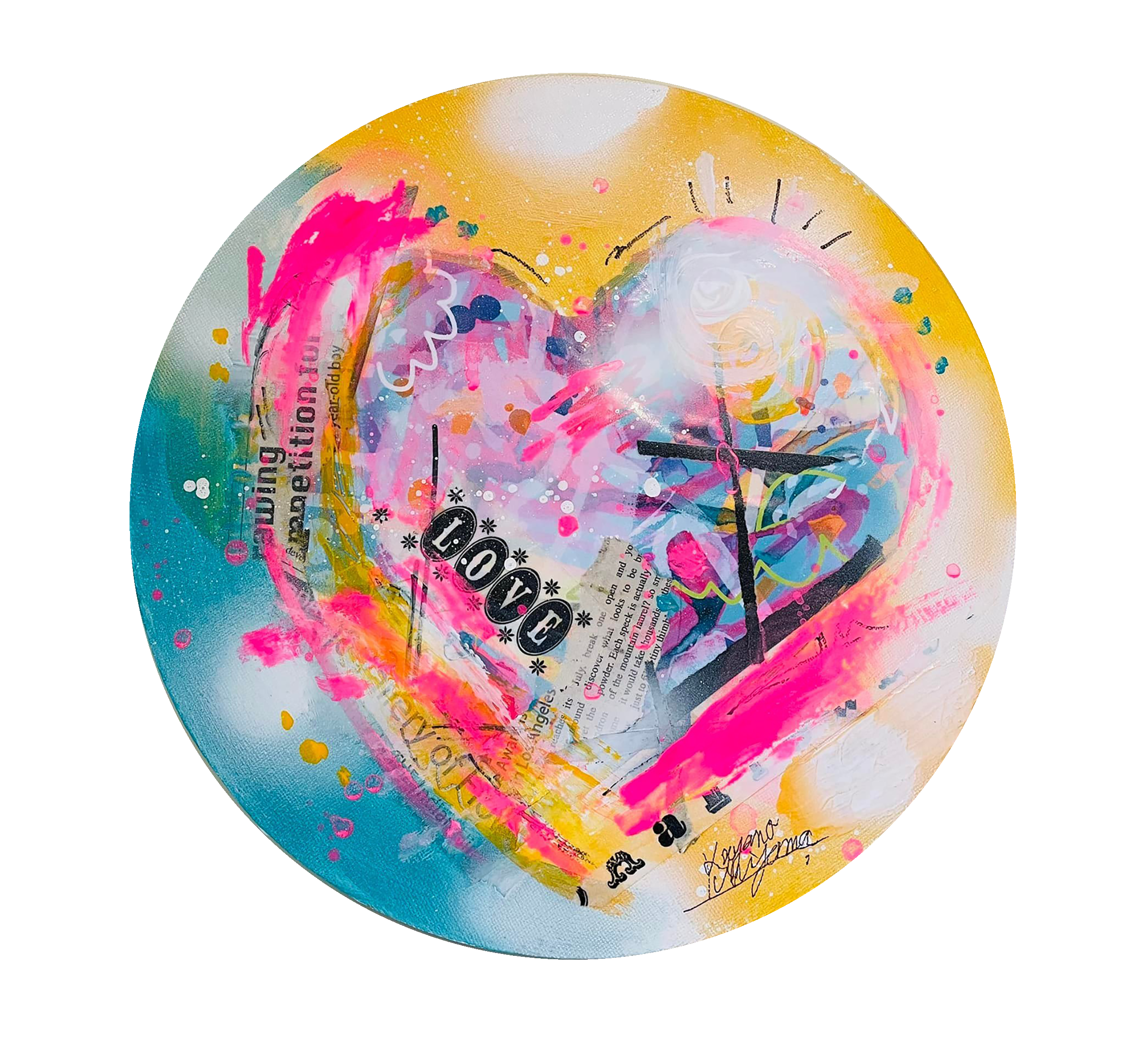 平和のハートを描きました。25cmの丸型キャンバスになります。