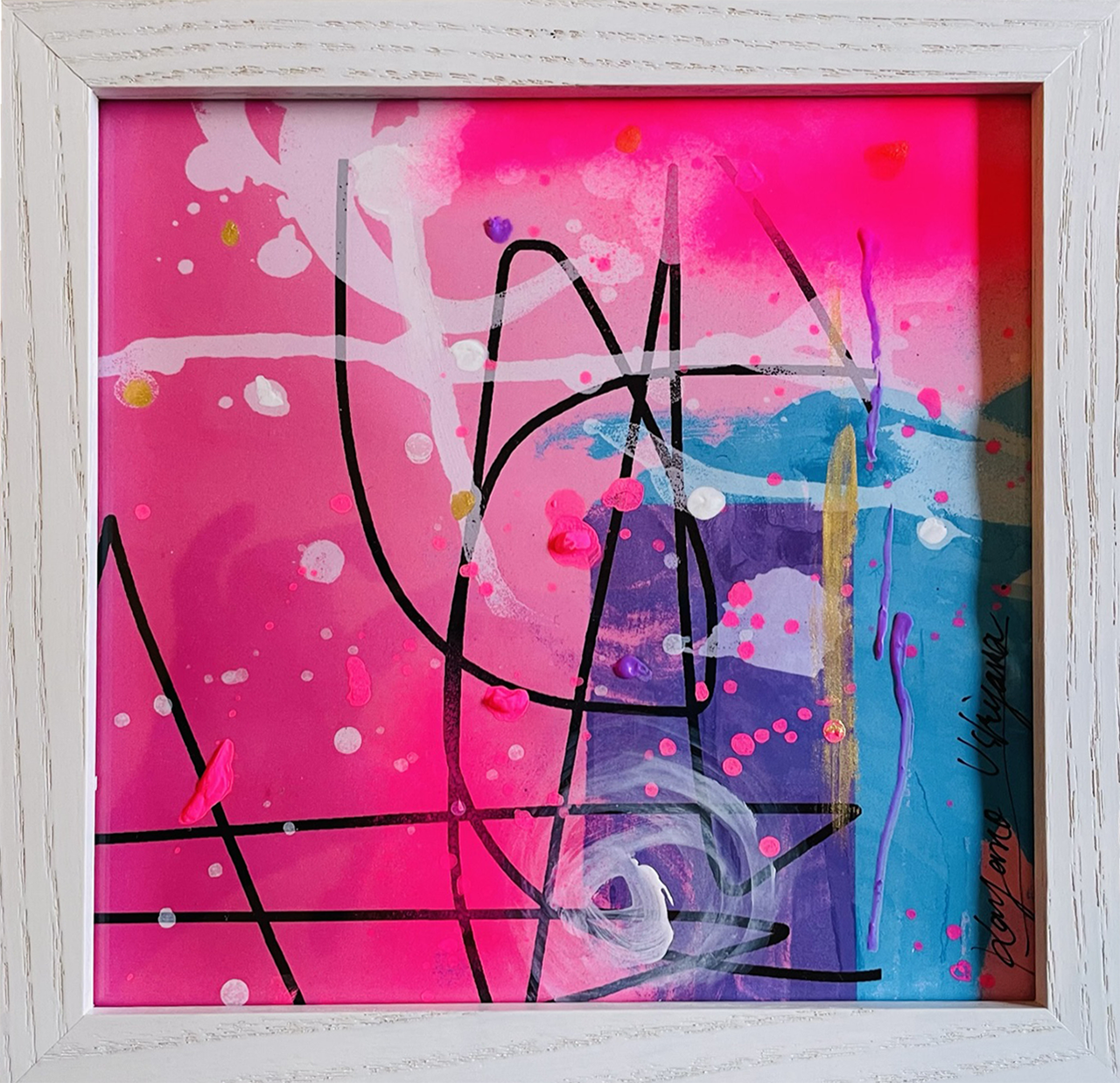 宇宙の粒子を感じて描いた作品です。15cmx15cmの額に入っています。部屋を明るくします!